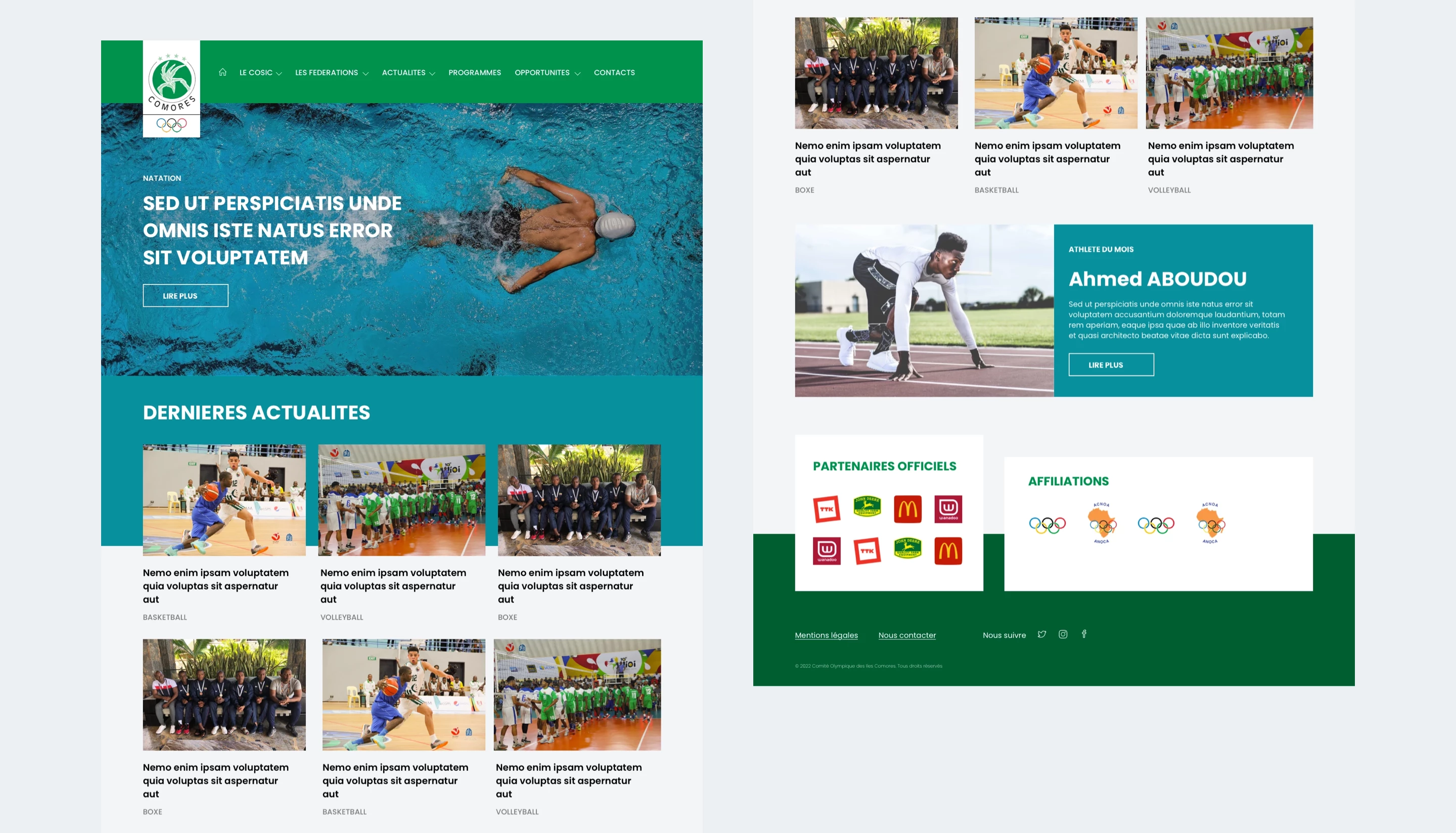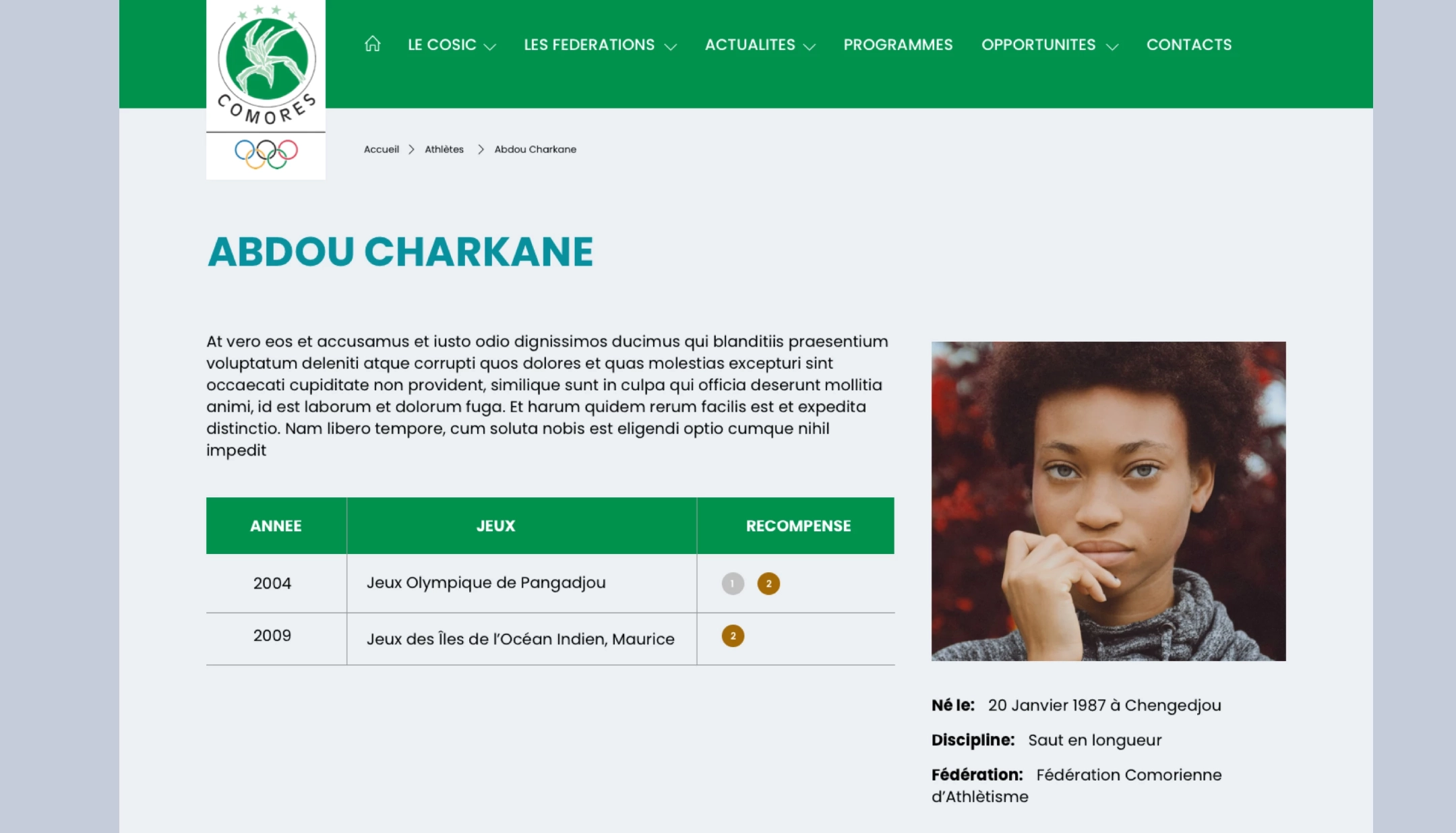 Le Comité Olympique et Sportif des Iles Comores (COSIC) est l’organisation faitière des fédérations sportives comoriennes et le représentant des Comores auprès du Comité International Olympique. Désireux de disposer d’un site web pour mettre en valeur ses actions et celles de ses fédérations membres, nous avons travaillé avec son équipe pour concevoir et développer un site attrayant et donnant à voir d’une manière simple l’ensemble de l’organisation et de l’action du mouvement olympique comorien.